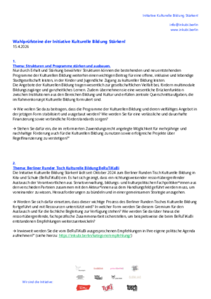 Die Initiative Kulturelle Bildung Stärken! ist ein Zusammenschluss, der die Programme der Kulturellen Bildung in Berlin vernetzt, deren Themen sichtbar macht und zum Austausch einlädt. Die Programme der Kulturellen Bildung in Berlin tragen seit Jahrzehnten wesentlich dazu bei, die im Berliner Rahmenkonzept Kulturelle Bildung formulierten Ziele zu erreichen. Die Kulturelle Bildung spielt eine zentrale Rolle, um Kindern und Jugendlichen Zugang zu Kunst und Kultur zu ermöglichen, gesellschaftlichen Zusammenhalt zu fördern und die aktive Mitgestaltung einer demokratischen Gesellschaft zu ermöglichen. Unsere Programme sind nicht nur ein wichtiger Baustein für eine ästhetische Weltaneignung, sondern auch für die Umsetzung des Kinderrechts auf Teilhabe.